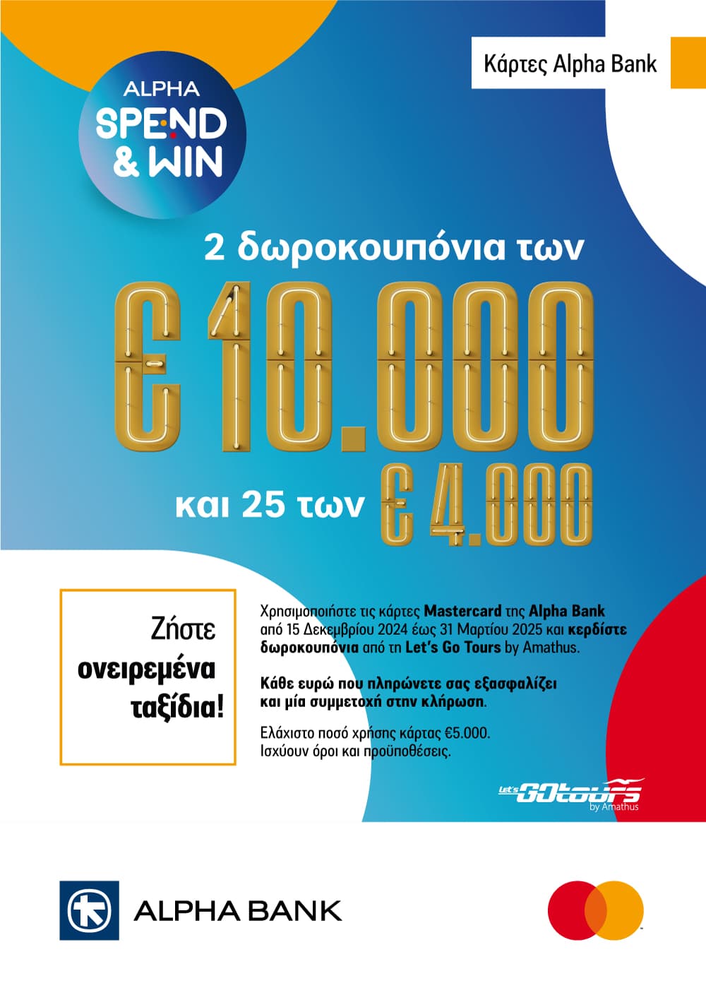 Ονειρεύεστε ταξίδια ως την άκρη του κόσμου; Ήρθε η ώρα να τα ζήσετε με το πρόγραμμα Alpha Spend & Win! Χρησιμοποιήστε οποιαδήποτε κάρτα Mastercard της Alpha Bank για τις αγορές σας από 15 Δεκεμβρίου 2024 έως 31 Μαρτίου 2025, και μπείτε στη μεγάλη κλήρωση που θα χαρίσει δωροκουπόνια από τη Let’s Go Tours by Amathus, για ταξιδιωτικά πακέτα (αεροπορικά εισιτήρια και ξενοδοχεία) και κρουαζιέρες.