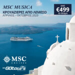Η Let’s Go Tours by Amathus, επιλεγμένος αντιπρόσωπος της MSC Cruises στην Κύπρο, ανακοινώνει την κυκλοφορία καταλόγου για τις κρουαζιέρες από Λεμεσό με το πολυτελές κρουαζιερόπλοιο MSC MUSICA για το 2023.