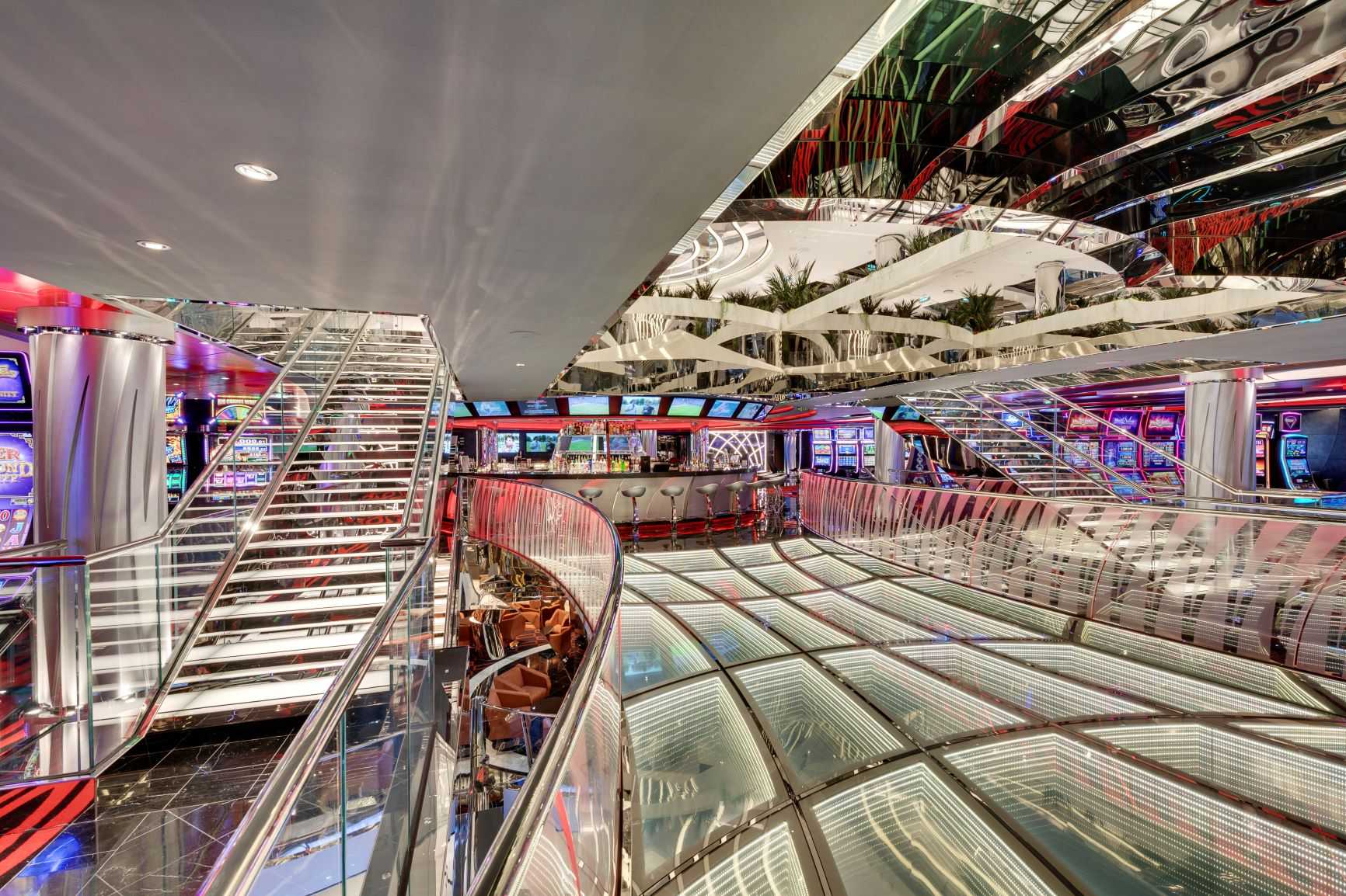 Το τεσσάρων καταστρωμάτων αίθριο με τοίχους από γυαλί δημιουργεί μία μοναδική ατμόσφαιρα για τις ζωντανές παραστάσεις που λαμβάνουν μέρος, διαθέοντας παράλληλα εξαιρετική θέα στην θάλασσα.